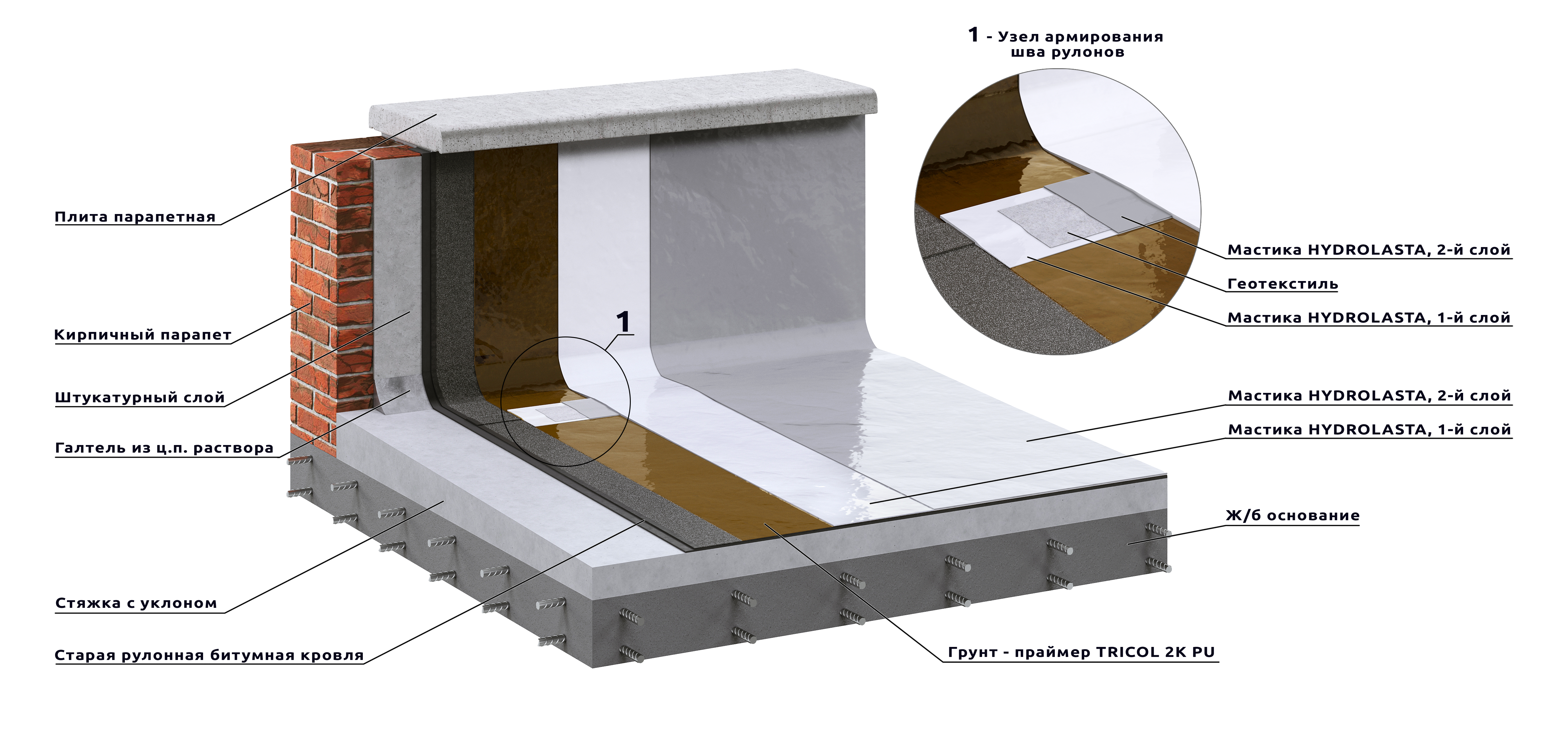 Грунт-праймер. Специальная марка PRIMER TRICOL 2K-PU (К) создаёт переходный слой с превосходной адгезией к любым битумным поверхностям. Расход: 0,25–0,3 кг/м².